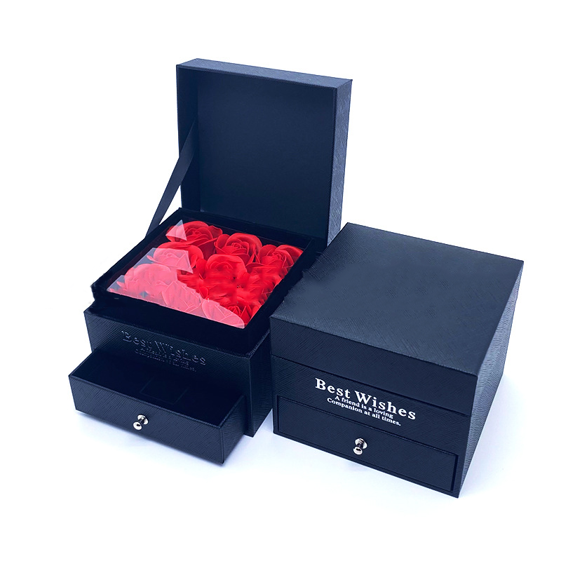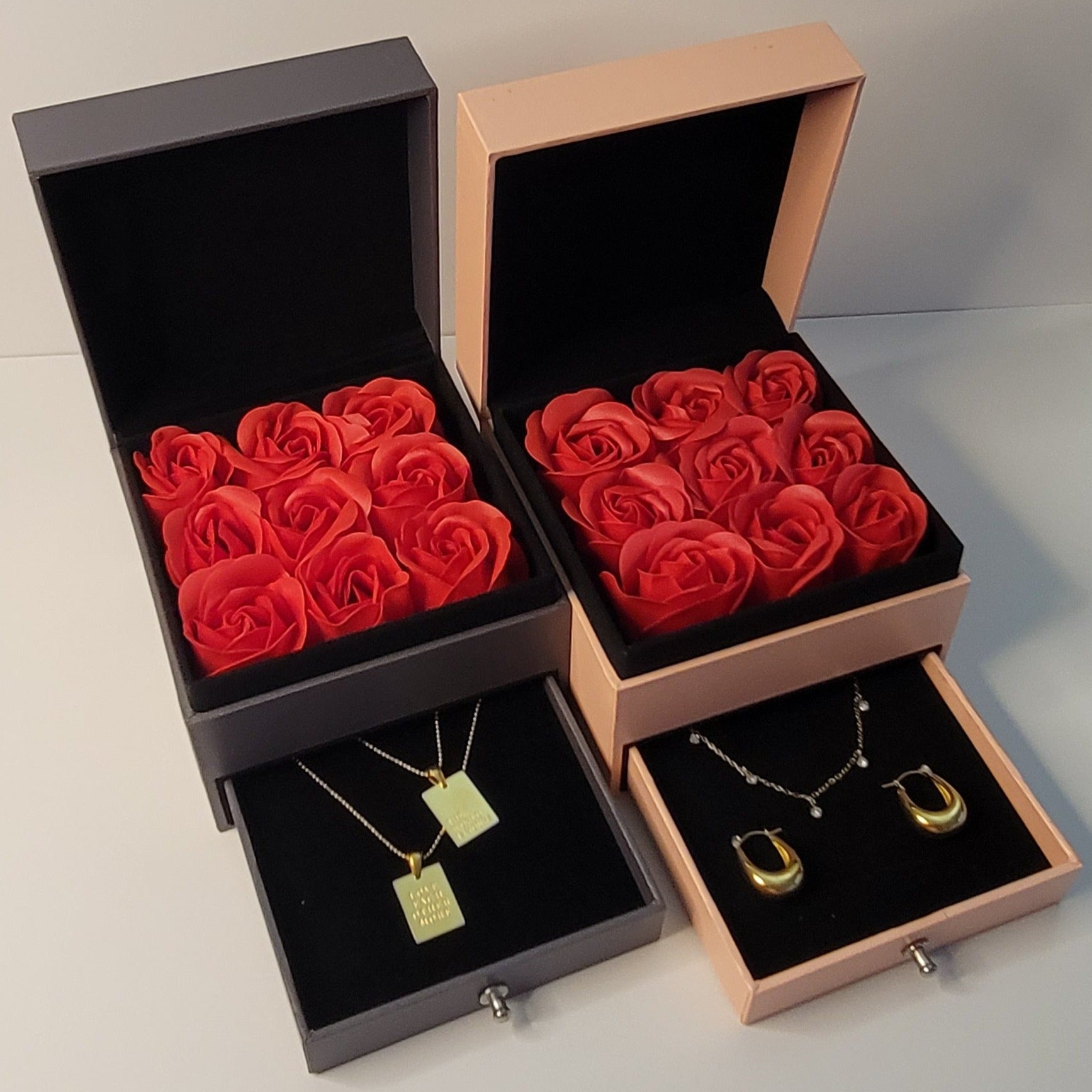 When opened box reveals 9 red roses, Under the box there is a drawer that is very suitable as a personal gift, e.g. B. jewelry ring, wedding ring or necklace. Or just place a necklace or wedding ring in the center of the rose as an unforgettable gift.
